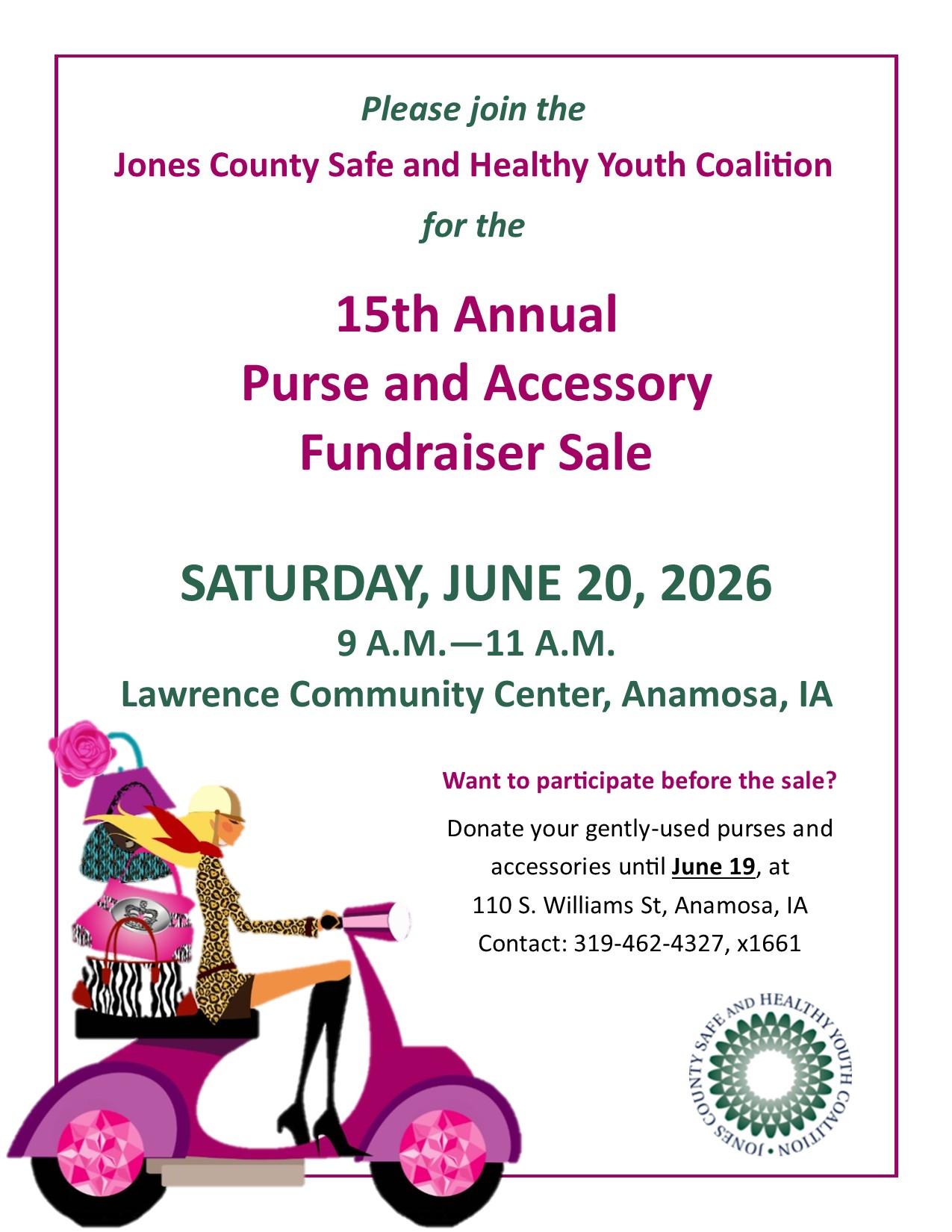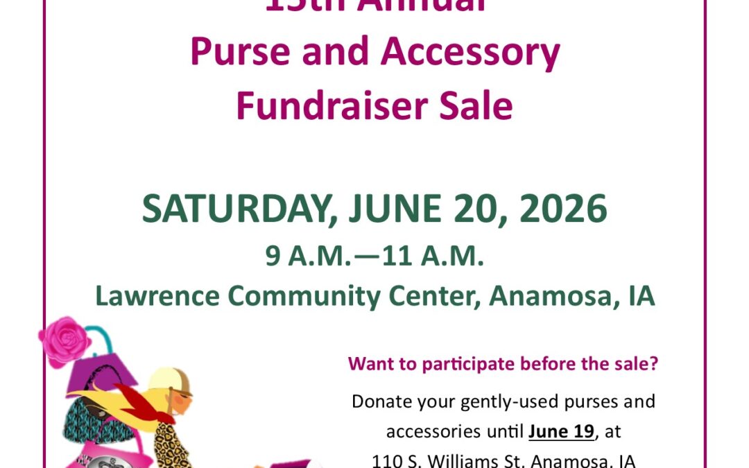 The Jones County Safe and Healthy Youth Coalition is again collecting clean, gently used, fashionable purses and accessories this year now through June 19th, the day before the sale. The Coalition’s 15th annual Coalition Purse and Accessory Sale Fundraiser will be held on Saturday, June 20th from 9-11 a.m. at the Lawrence Community Center in Anamosa. Items can be dropped off at the Coalition/ASAC office at 110 S. Williams St. in Anamosa or at Michael’s Clothing in Monticello during business hours. Donators can call ahead at 319-462-4327 x1661 to make sure someone is at the Coalition/ASAC office, but generally there is. Prevention staff can also safely help carry items from your car, if needed.